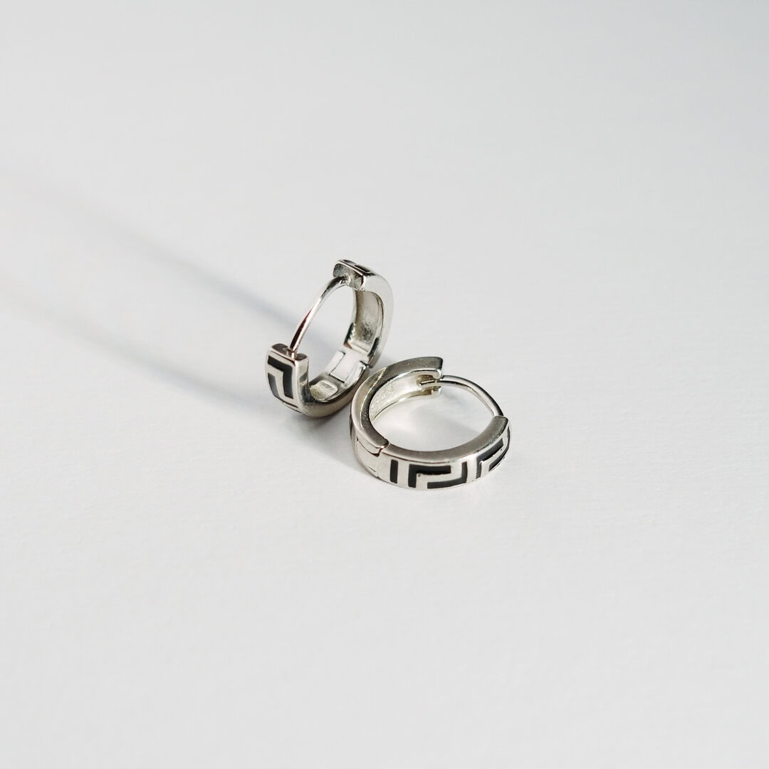 925 Sterling Silver Greek Key Pattern Hoop Earrings for Men | Unisex Bali
